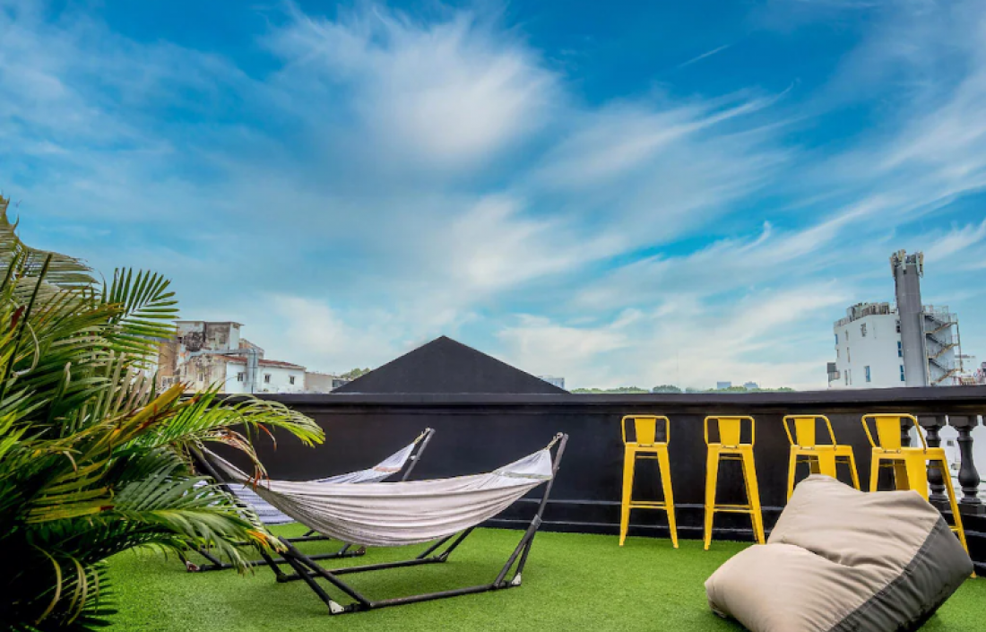 해먹으로 장식된 객실과 루프탑이 있는 호텔
